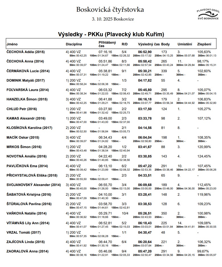 Místo pátečního tréninku jsme se v Boskovicích tradičně zúčastnili závodu na 400 metrů, mladší plavali pouze 200 metrů.